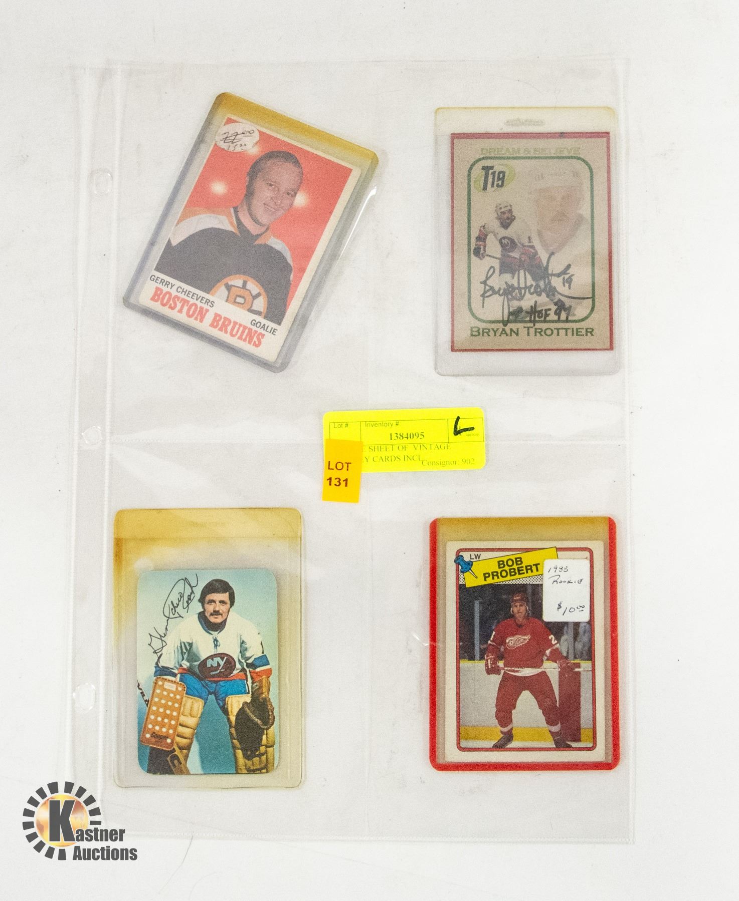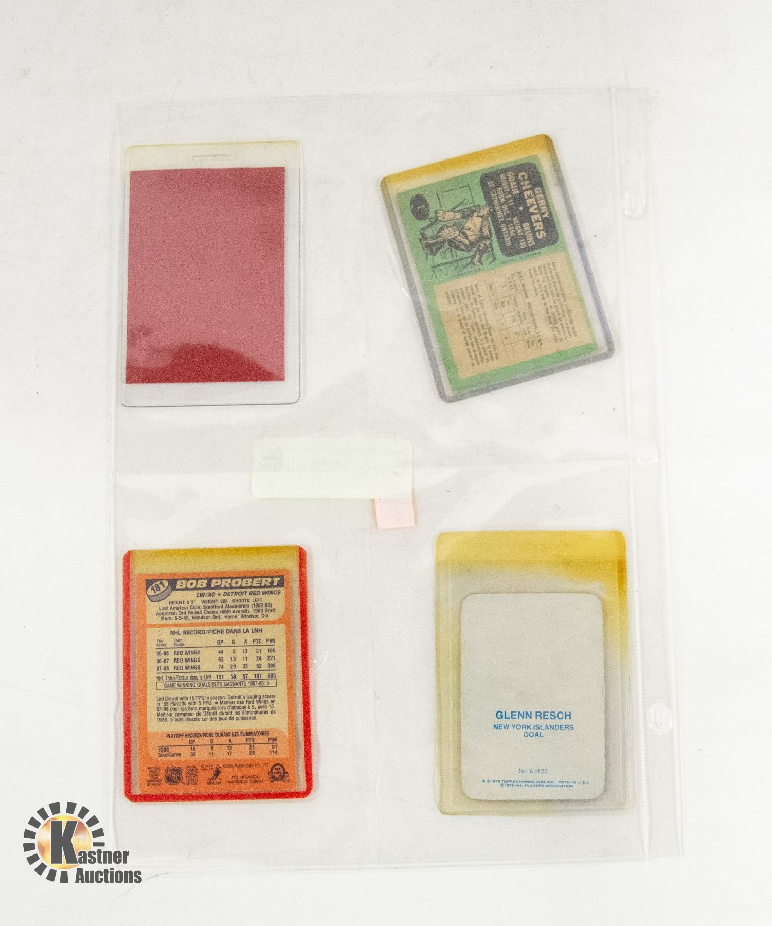 1969/70 GERRY CHEEVERS, 1976 GLENN RESCH SIGNED CARD, 1988 BOB PROBERT - ROOKIE, AND BRYAN TROTTIER SIGNED 1997 HALL OF FAME INDUCTION CARD **ALL ITEMS MUST BE REMOVED BY 5PM SATURDAY, FEBRUARY 8TH 2025. ALL REMAINING ITEMS WILL BE SUBJECT TO A $6.00 PER DAY STORAGE CHARGE. ANY ITEMS REMAINING AFTER MONDAY, MARCH 3RD 2025 WILL BE CONSIDERED FORFEITED. NO REFUNDS WILL BE ISSUED FOR FORFEITED ITEMS. TO SCHEDULE A PICK UP APPOINTMENT CLICK HERE