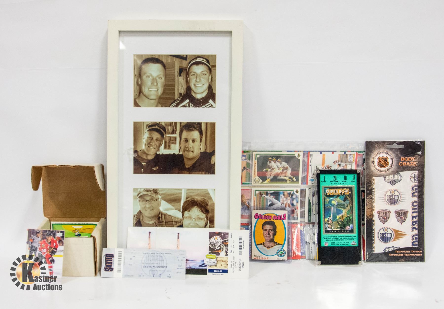COLLECTION INCL. SUPERBOWL XXXVII SEAT TICKET IN ACRYLIC CASE, VINTAGE TOMMY WILLIAMS - 1971 GOLDEN SEALS HOCKEY CARD, "HULL" FAMILY PHOTOS, SHEETS OF VINTAGE HOCKEY AND BASEBALL CARDS, BOX OF VINTAGE UPPERDECK LOONEY TUNES CARDS, ETC. **ALL ITEMS MUST BE REMOVED BY 5PM SATURDAY, APRIL 29TH 2023. ALL REMAINING ITEMS WILL BE SUBJECT TO A $6.00 PER DAY STORAGE CHARGE. ANY ITEMS REMAINING AFTER MONDAY, MAY 15TH, 2023 WILL BE CONSIDERED FORFEITED. NO REFUNDS WILL BE ISSUED FOR FORFEITED ITEMS. TO SCHEDULE A PICK UP APPOINTMENT CLICK HERE