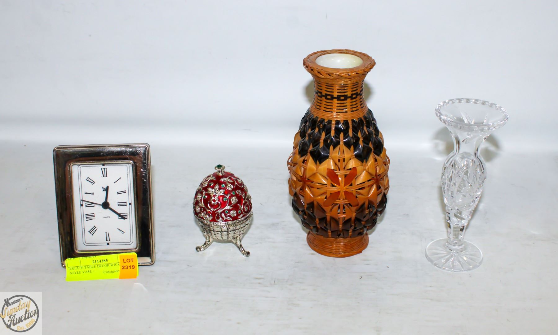 BATTERY OP. QUARTZ DESK CLOCK + PINWHEEL CRYSTAL SINGLE FLOWER VASE + RED VELVET LINED 3 LEGGED UKRANIAN STYLE TRINKET/RING HOLDER ALL TOGETHER **ALL ITEMS MUST BE REMOVED BY 5PM SATURDAY, SEPTEMBER 27TH 2025. ALL REMAINING ITEMS WILL BE SUBJECT TO A $6.00 PER DAY STORAGE CHARGE. ANY ITEMS REMAINING AFTER MONDAY, OCTOBER 13TH 2025 WILL BE CONSIDERED FORFEITED. NO REFUNDS WILL BE ISSUED FOR FORFEITED ITEMS. TO SCHEDULE A PICK UP APPOINTMENT CLICK HERE
