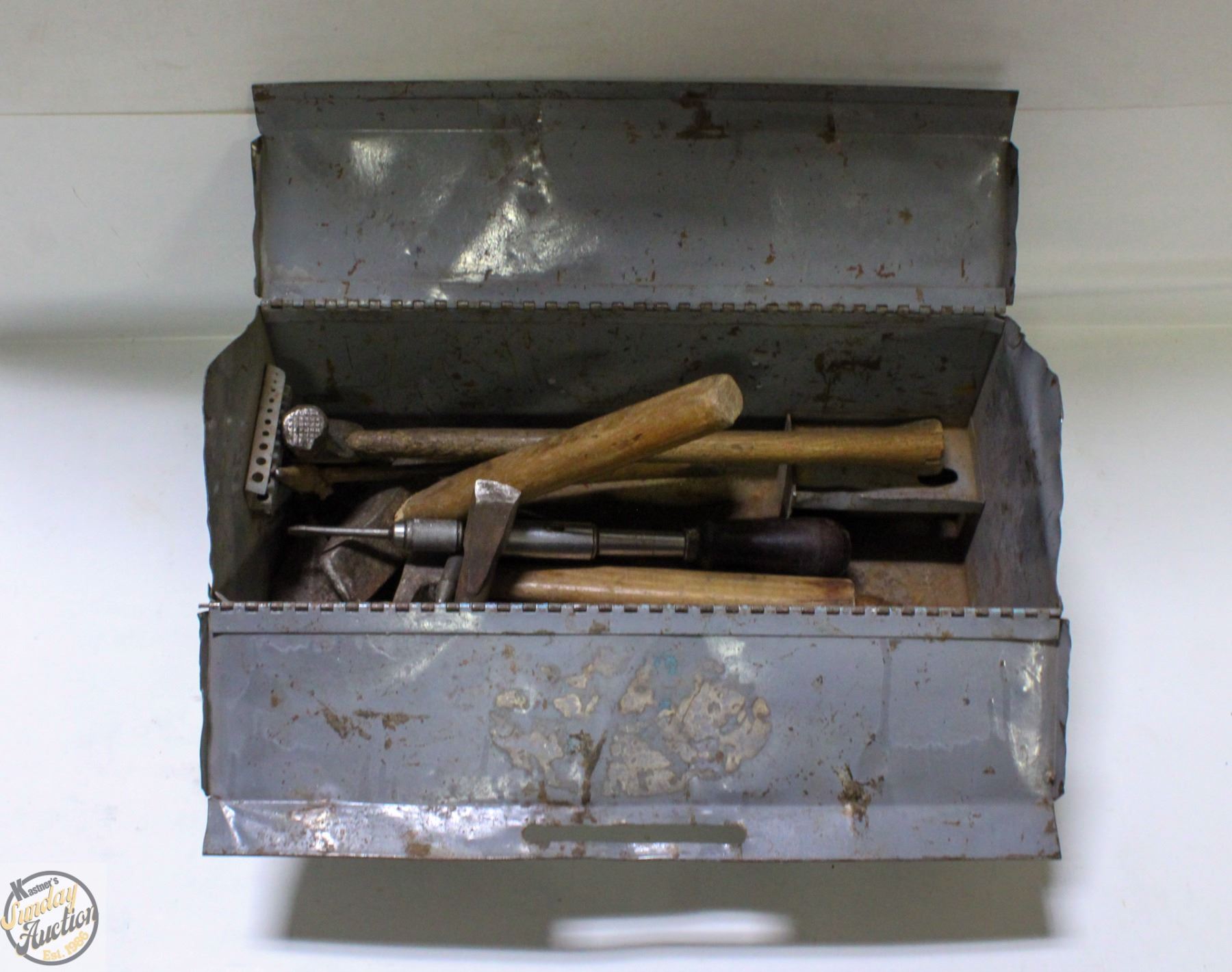 ESTATE TOOL BOX OF VINTAGE METAL WORKING HAMMERS