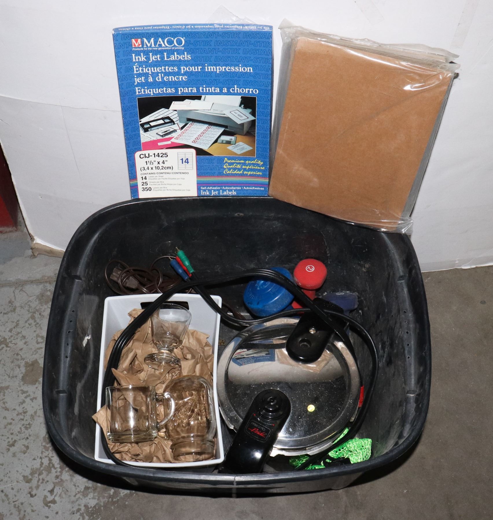 INCLUDING SOME GLASSWARE, PRESSURE COOKER (MISSING HANDLE?), SPECIALTY PRINTER PAPER, AND MORE