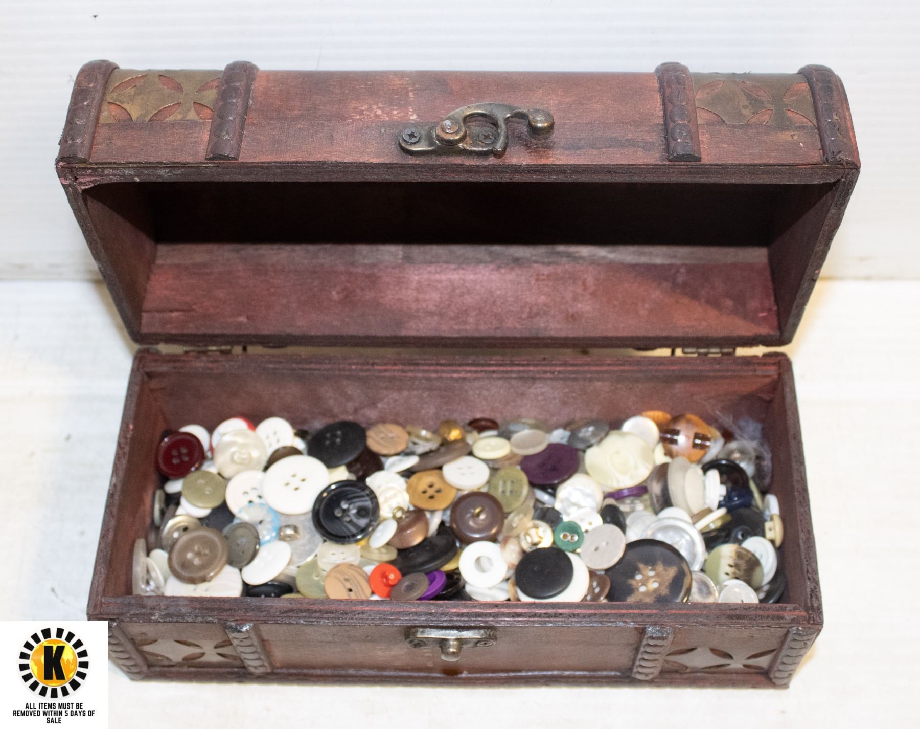 ESTATE VINTAGE BUTTONS IN TREASURE CHEST BOX