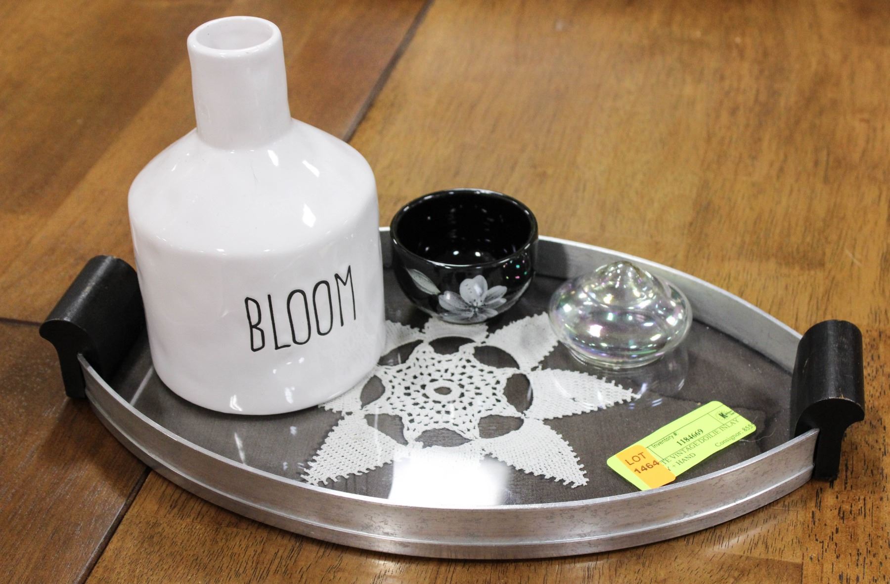 PAINTED SMALL DISH + WHITE BLOOM VASE WITH IRRIDSCENT ART GLASS PIECE **ALL ITEMS MUST BE REMOVED BY 5PM SATURDAY, MARCH 8TH 2025. ALL REMAINING ITEMS WILL BE SUBJECT TO A $6.00 PER DAY STORAGE CHARGE. ANY ITEMS REMAINING AFTER MONDAY, MARCH 24TH 2025 WILL BE CONSIDERED FORFEITED. NO REFUNDS WILL BE ISSUED FOR FORFEITED ITEMS. TO SCHEDULE A PICK UP APPOINTMENT CLICK HERE