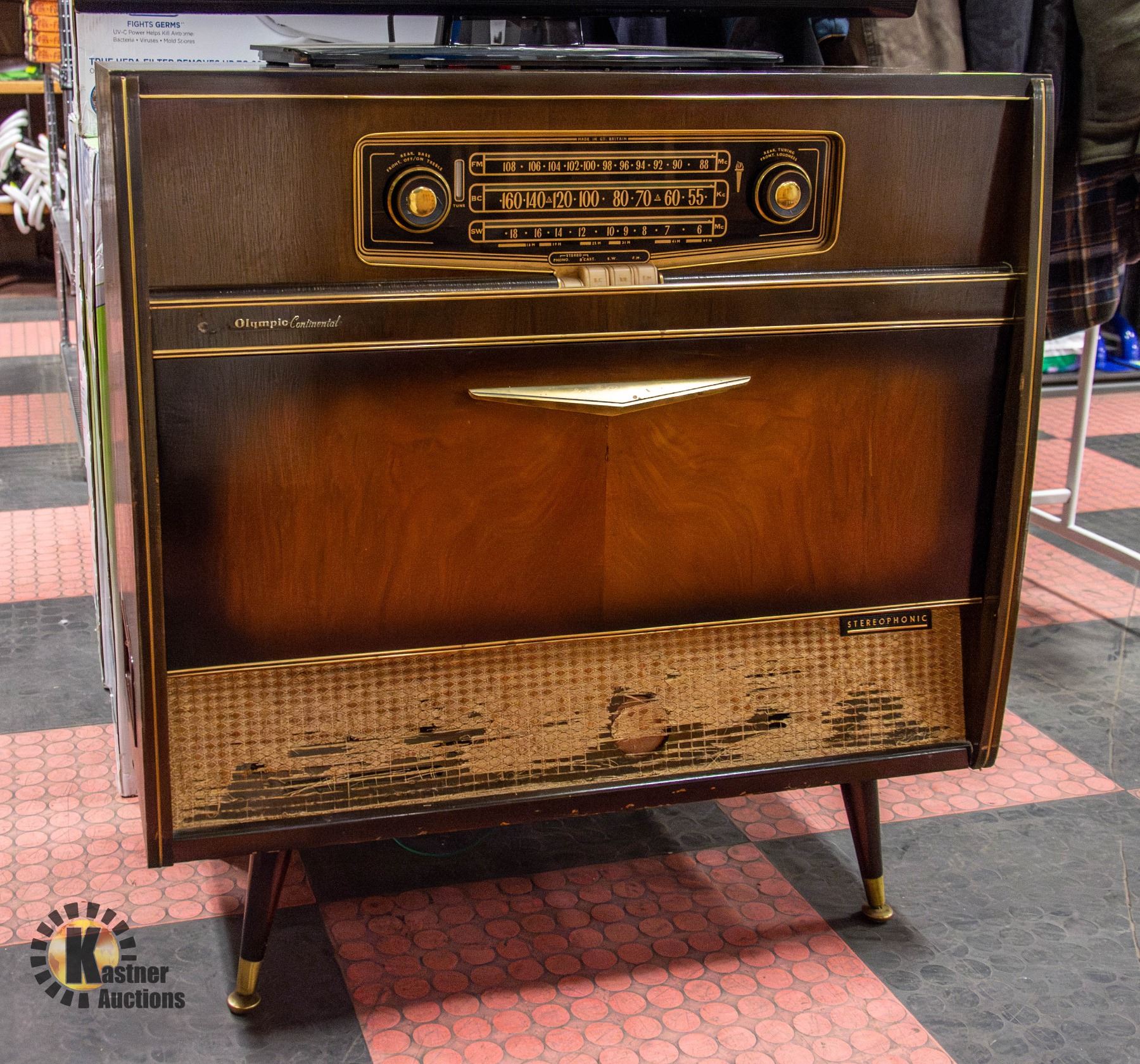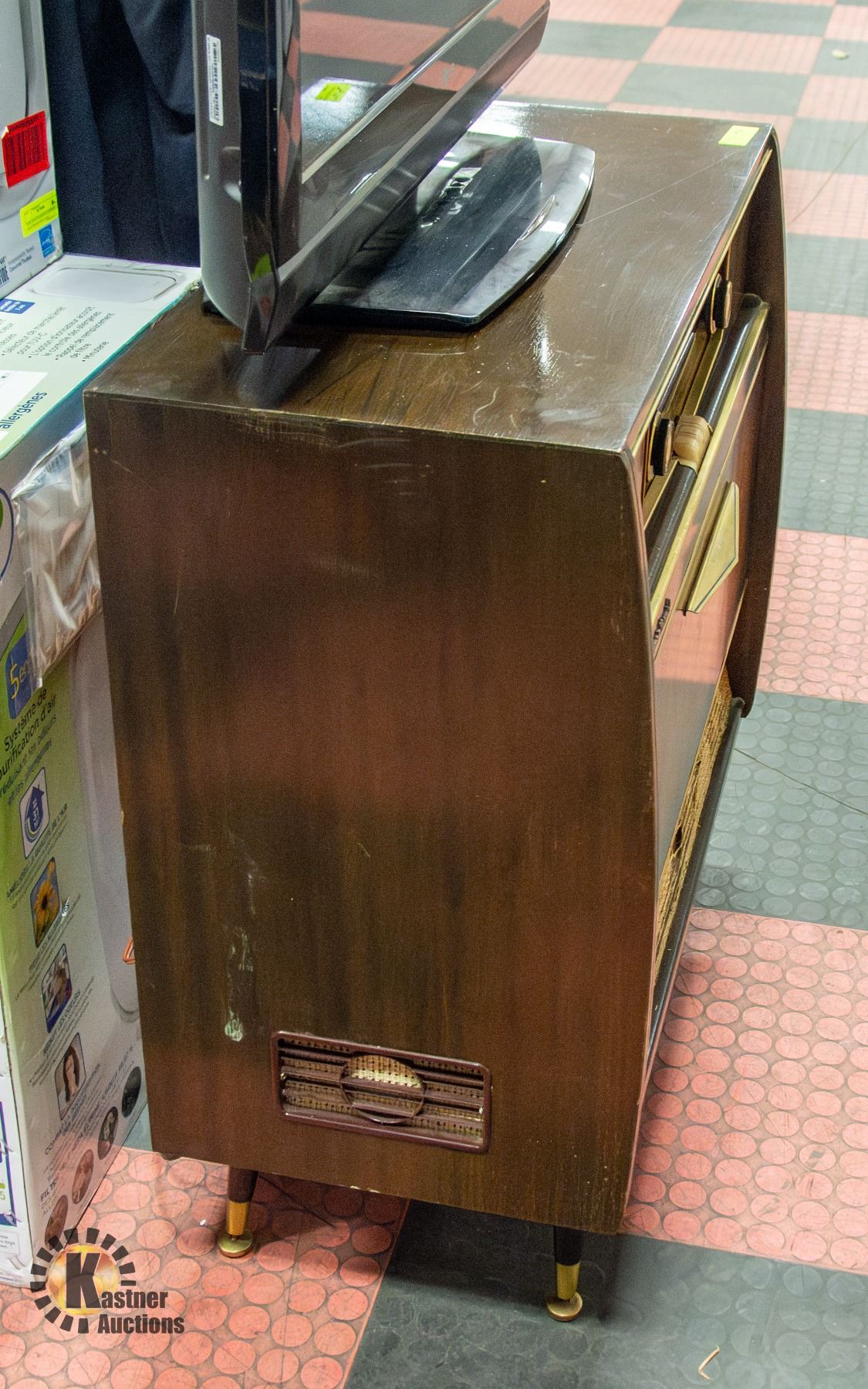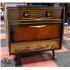 CONTINENTAL CONSOLE RADIO - RECORD PLAYER - SOLID WOOD CABINET, GLASS, KNOBS AND PUSH BUTTONS ALL IN WORKING CONDITION, BRITISH MADE - RECORD PLAYER IN BOTTOM CABINET, STEREO SPEAKER SYSTEM, TESTED IN "VINTAGE" WORKING CONDITION (32"L X **ALL ITEMS MUST BE REMOVED BY 5PM SATURDAY, JULY 1ST 2023. ALL REMAINING ITEMS WILL BE SUBJECT TO A $6.00 PER DAY STORAGE CHARGE. ANY ITEMS REMAINING AFTER MONDAY, JULY 17TH, 2023 WILL BE CONSIDERED FORFEITED. NO REFUNDS WILL BE ISSUED FOR FORFEITED ITEMS. TO SCHEDULE A PICK UP APPOINTMENT CLICK HERE