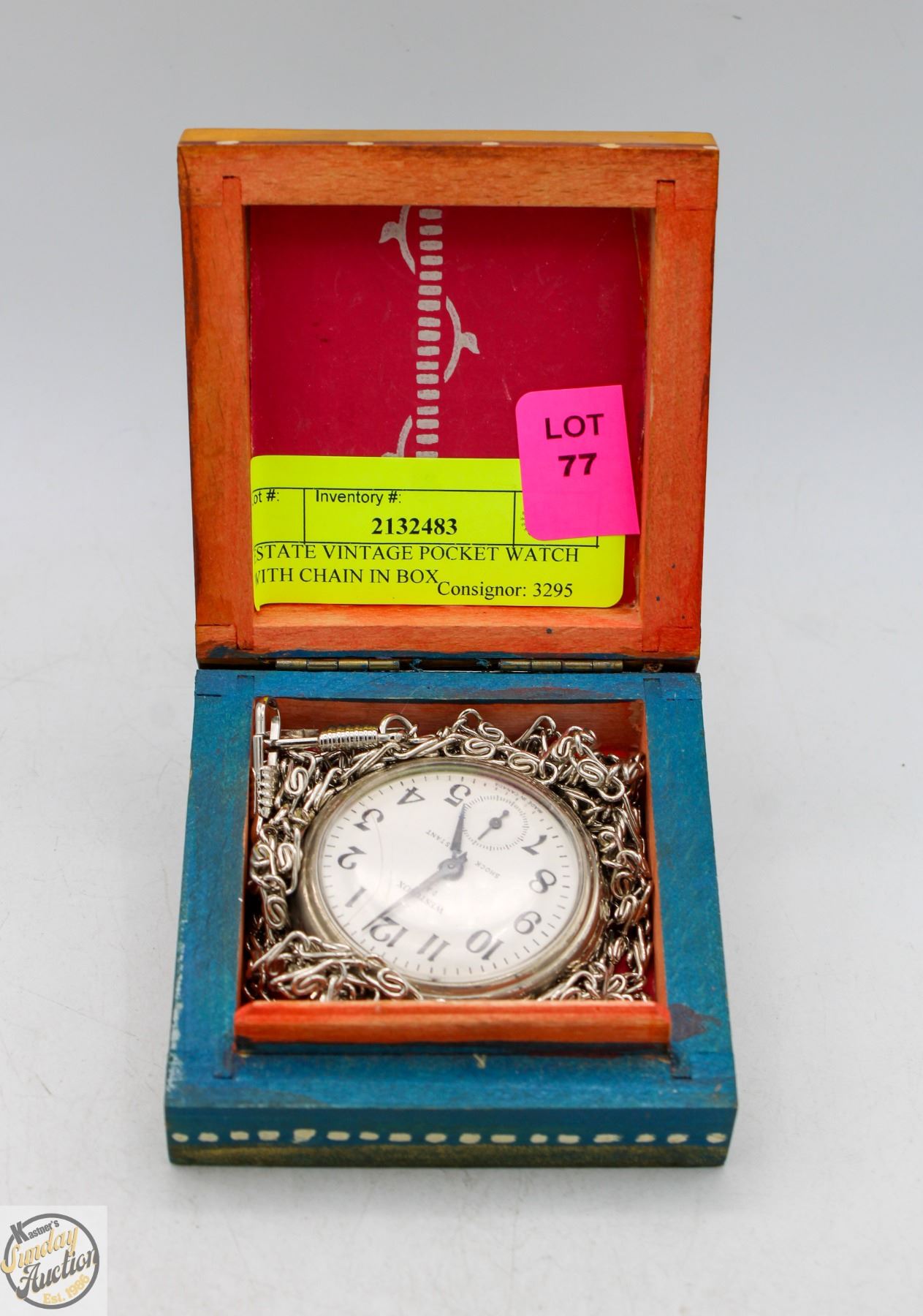 ESTATE VINTAGE POCKET WATCH WITH CHAIN IN BOX
