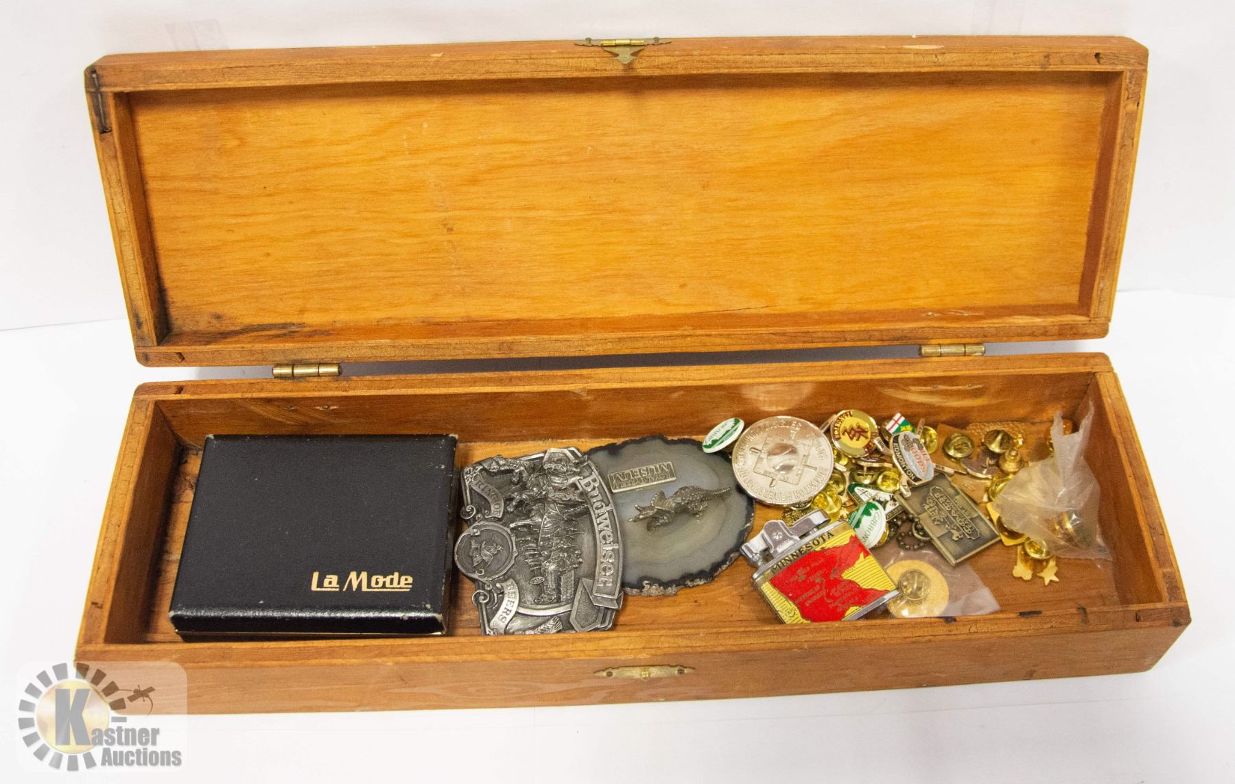 ESTATE WOOD BOX WITH COLLECTIBLE PINS,