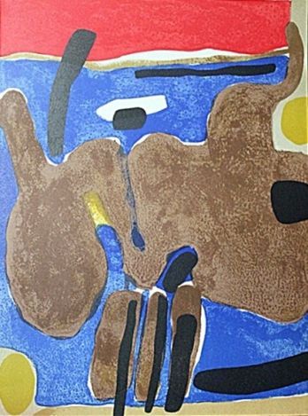 MAURICE ESTEVE - ORIGINAL LITHOGRAPH - "COMPOSITION" - ON VELIN D' ARCHES WOVE PAPER - PRINTED IN 1964 BY THE LEGENDARY ATELIER FERNAND MOURLOT, MOURLOT FRERES, PARIS FRANCE - ISSUED IN A LIMITED EDITION OF 2000 - NOT SIGNED - SHEET SIZE: 10" X 7 1/2" (255 X 185 MM) - PROFESSIONALLY FRAMED AND MATTED - THIS ESTEVE ORIGINAL LITHOGRAPH IS FROM THE SCARCE AND LAVISHLY-PRODUCED LIMITED EDITION CATALOGUE, "PRINTS FROM THE MOURLOT PRESS". PUBLISHED IN 1964 BY MOURLOT ON THE OCCASION OF THEIR LANDMARK TRAVELING EXHIBITION, WHICH WAS SPONSORED BY THE FRENCH EMBASSY AND THE SMITHSONIAN - THE CATALOG WAS LIMITED TO 2000 COPIES ON VELIN DE ARCHES WOVE PAPER AND 200 COPIES ON VELIN DE RIVES PAPER WHICH WERE RESERVED FOR THE ARTISTS