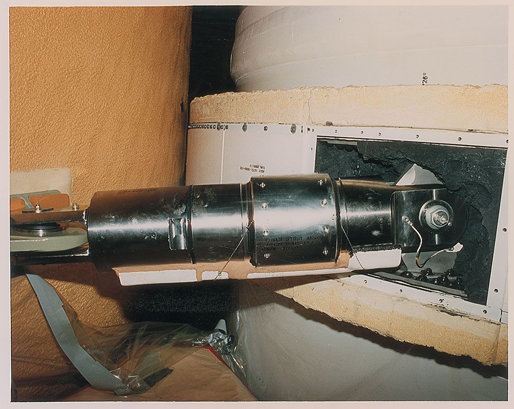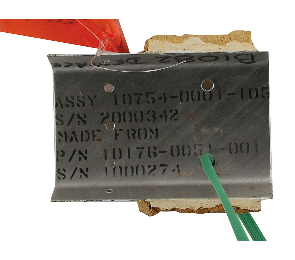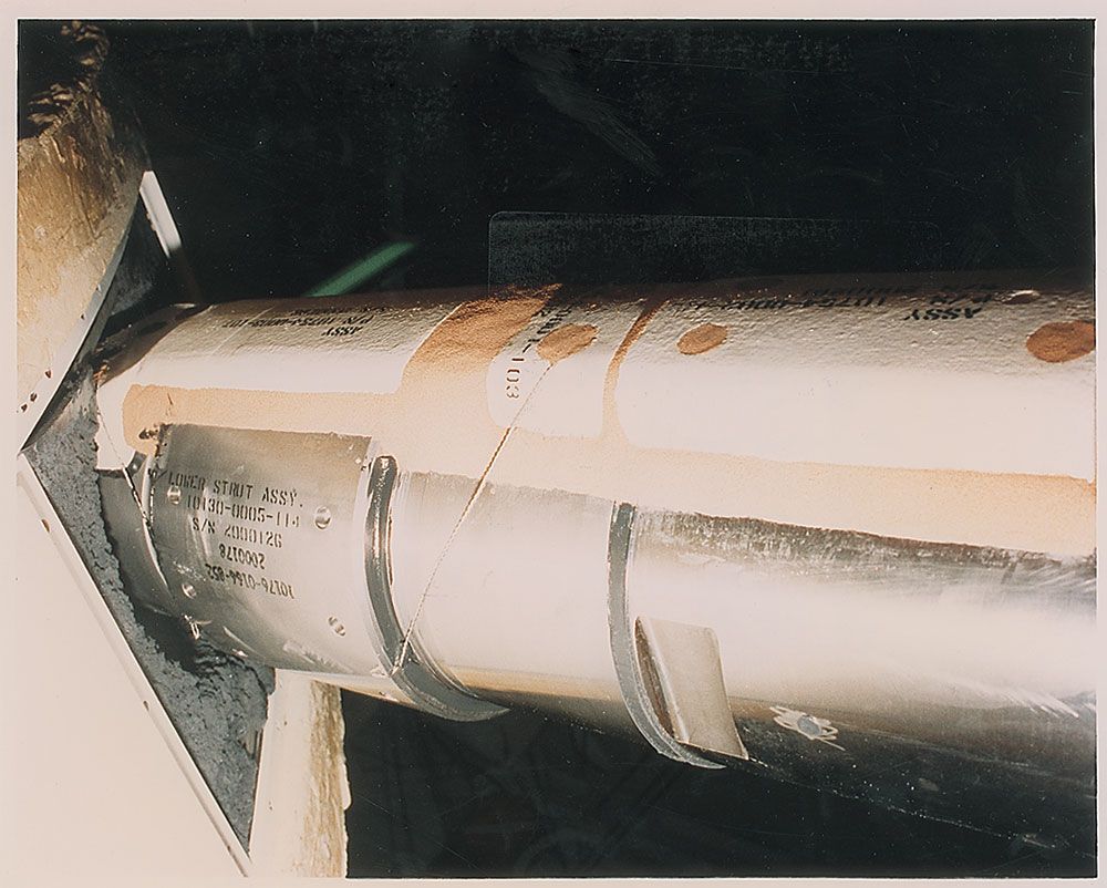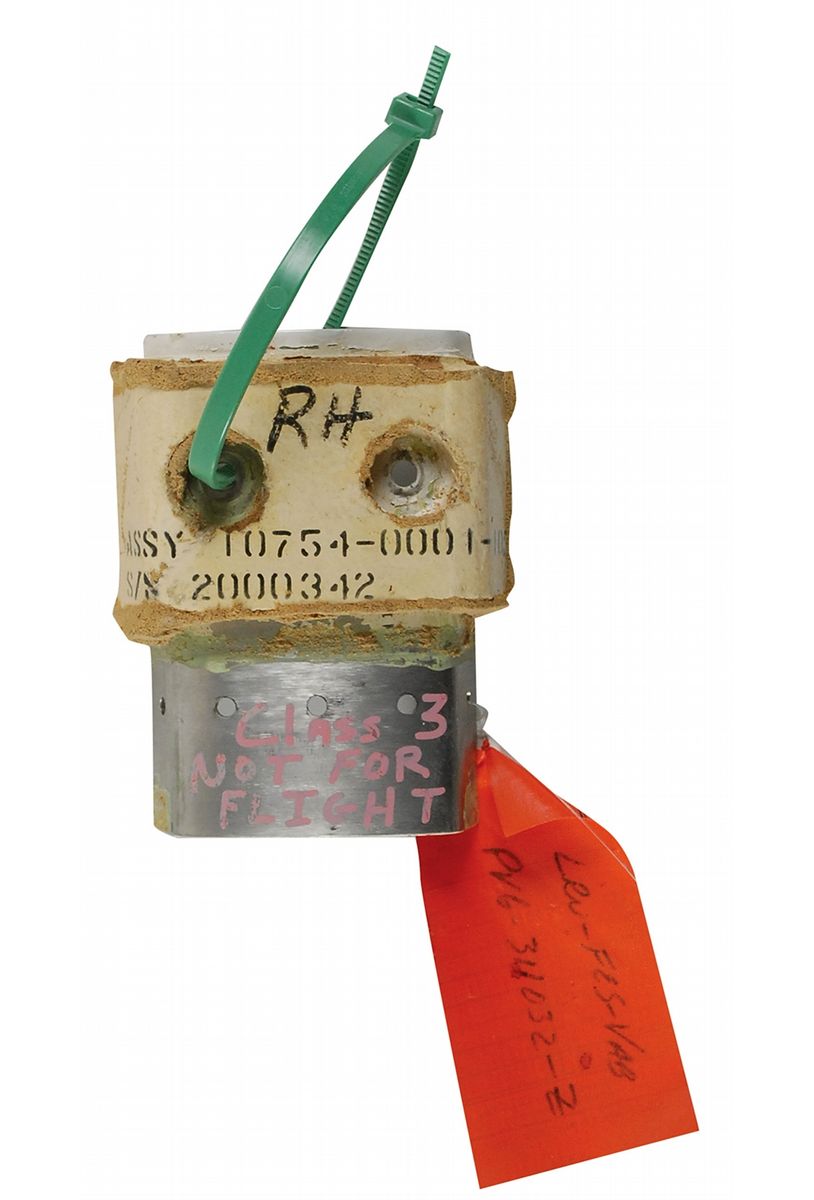 NASA ET/SRB Strut Firing Line Cover, serial no. 2000342, 5.5? long. Metal and composite cover is labeled near the bottom, “Class 3 Not for Flight,” with an orange non-conforming material label attached through one hole, and is associated to the shuttle Endeavour. This cover is used on the lower or diagonal strut between the Solid Rocket Booster and external tank to protect the separation firing line from excessive heat typically seen at liftoff. In fine condition. Accompanied by two photos of this part installed on the shuttle; the flight status is unknown.