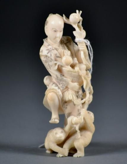 Finely Carved Ivory Figure of Man and Monkey, measures 4 inches tall