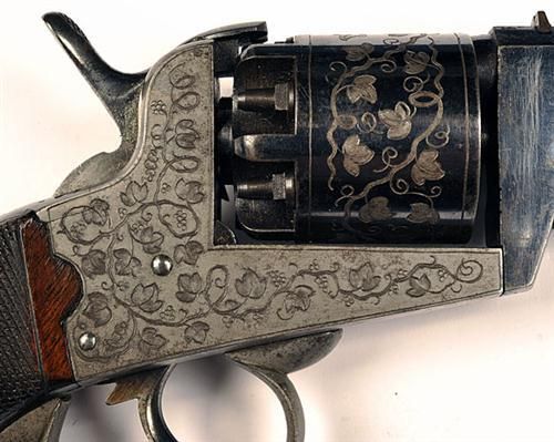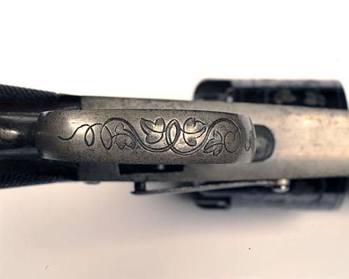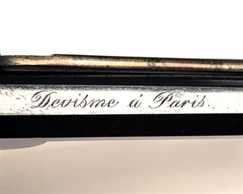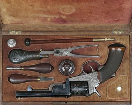 Prototype, DEVISME a PARIS 80-BORE PERCUSSION SIX-SHOT DOUBLE-ACTION REVOLVER. A fine exhibition piece used in an attempt to secure a confederate CS contract. Only know engraved, cased, divisme. Without serial number. A collection in itself.