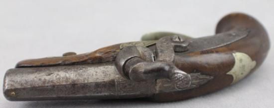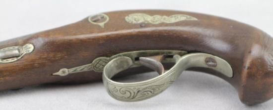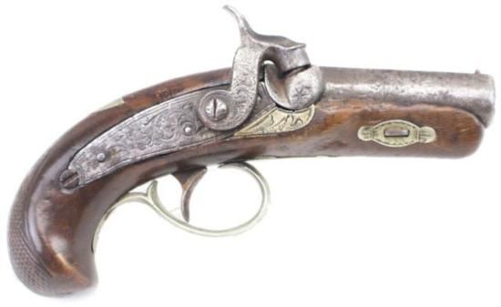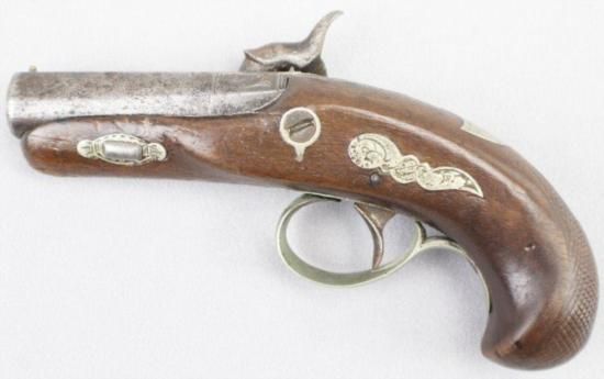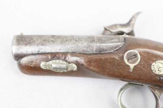 1850 41 CAL DERINGER COPY PERCUSSION POCKET PISTOL . Small size with 2.5 inch rifled barrel. Scroll engraved lock and cock. Some ligith age pitting. In working order. White metal fittings. Walnut stock. Size: 6 inches