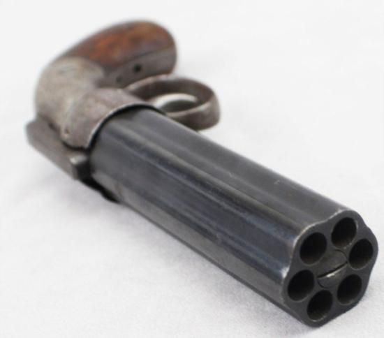 ALLENS PATENT PERCUSSION PEPPERBOX PISTOL 30 cal, 6 barrel cylinder of 4.25 inches. Foliate engraved steel frame, and plain wood grips. The metalwork has some surface pitting. Cylinder is stamped ~Allen & Thurber. Worcester~ and has been re-blued. Working action. Size: 8.5 inches