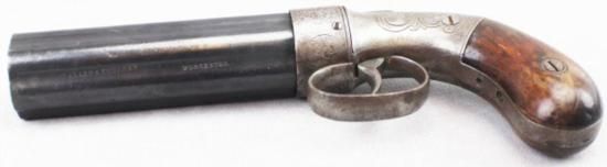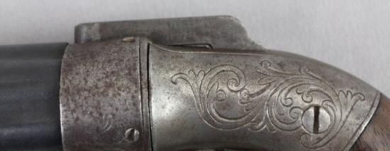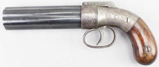 ALLENS PATENT PERCUSSION PEPPERBOX PISTOL 30 cal, 6 barrel cylinder of 4.25 inches. Foliate engraved steel frame, and plain wood grips. The metalwork has some surface pitting. Cylinder is stamped ~Allen & Thurber. Worcester~ and has been re-blued. Working action. Size: 8.5 inches