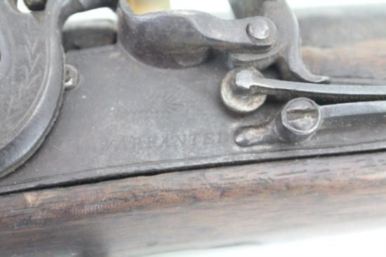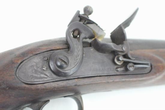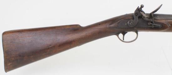 ENGLISH MADE 19TH CENTURY FLINTLOCK TRADE MUSKET 39.5inches round barrel. 70 bore. Walnut stock running full length of the barrel. Brass guard and butt-plate, wood ramrod. Working action (no half cock), The lock stamped ~Warranted~. bore is clear. Very old repair to the grip. Generally very good. Trade muskets were longer because they were traded against a pile of furs. The pile had to match the height of the gun when stood on its butt plate. Size: