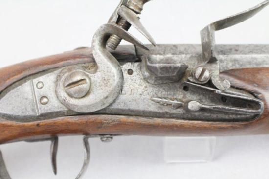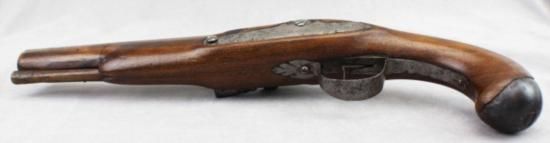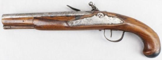 FRENCH 19TH CENTURY FLINTLOCK PISTOL BY LIECOMTE 54 cal, 9 inch rifled octagonal barrel. Plain lock engraved with ~Liecomte~. Cock is in working order. Walnut stock with steel fittings. An old fore-end replacement piece to the stock. Size: 15.5 inches