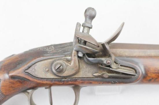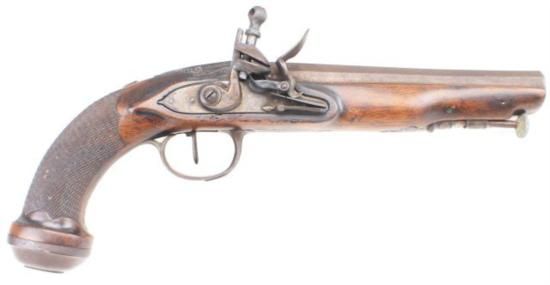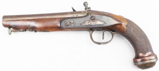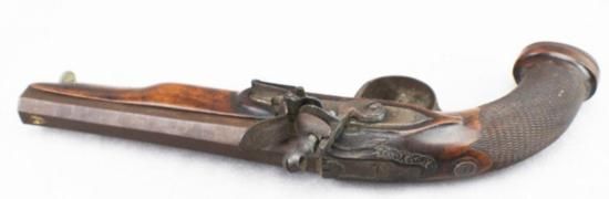 19TH CENTURY GERMAN FLINTLOCK PISTOL 60 cal, 7.25 inch octagonal barrel.. Foresight (broken) ad inVin rear sight. Each sight is gilded. Plain Lock, cock has been repaired and is in working order. Walnut stock with checkered grip and steel fittings, large steel butt cap. Stock has minor bruising and a small hairline split to the fore-end. Size: 13.5 inches over all
