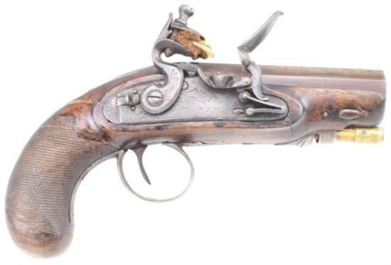 ENGLISH FLINTLOCK POCKET PISTOL BY W COLE 60 cal, 3.5 inch octagonal barrel. Foresight. Folliate engraved lock engraved W Cole. Lock and cock is in working order. Walnut stock with steel fittings and replaced ramrod. some old repairs to stock. Size: 7.5 over all