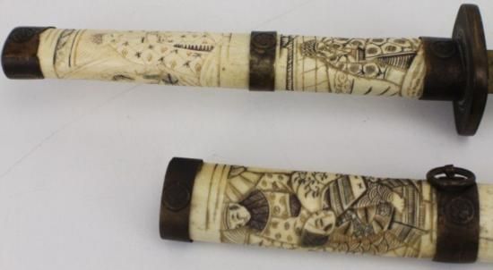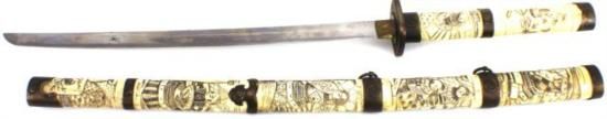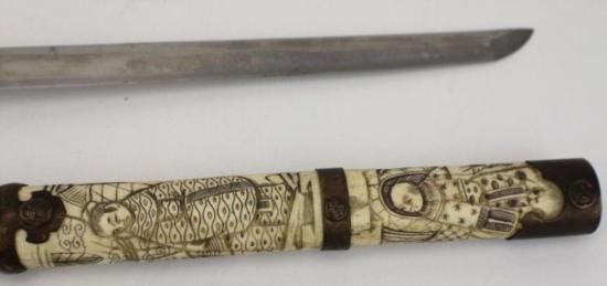 JAPANESE WAKIZASHI SWORD BONE SHEATH Sword hilt and scabbard are bone. Japanese nobles are carved into the ivory. Steel blade is in good condition, minor aging. Tsuba is a little loose. Blade is 18-1/4in Size: 27.5in