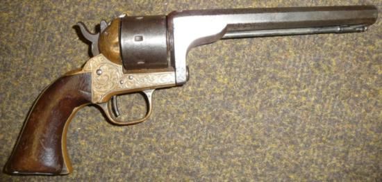 ET0503120083 A 19th Century American Seven Shot Rimfire Revolver, with 15cm octagonal steel barrel, numbered 3388, under-lever rammer, plain cylinder, the bronze frame bearing traces of original plating, engraved with scrolling foliage, with two piece walnut grip