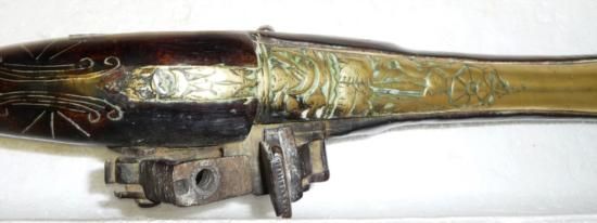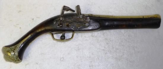 ET0503120088 A 19th Century Spanish Micquelet Lock Holster Pistol, the 21cm swamped brass barrel with foliate cast decoration to the breech, steel lock lacking upper jaw, wood stock with foliate chased brass trigger guard and spurred pommel, af