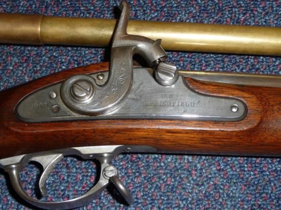 ET0503120095 A US Springfield 1864 Percussion Cap Target Rifle, the 78.5cm heavy steel barrel stamped 1864 P, the lock plate engraved with an eagle with shield to its breast and stamped 1864 US SPRINGFIELD, the two band wood full stock with steel trigger guard and sling swivels, the left side with two inspector's cartouches, set with a brass scope