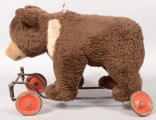 Plush Ride able Toy Brown Bear on Wheels. Dark brown fur with tan face and shoulders, glass eyes and thread nose and mouth. Loop handle protrudes from top of back at neck. Bear mounted on a heavy wire frame with stationary axle rear wheels and individual caster mounted front wheels. Red metal wheels with black rubber tires. Bear growl ring pull on top behind handle. 18inh. X 26inl.