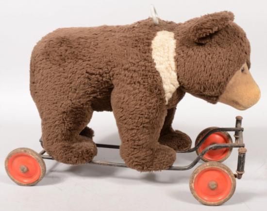 Plush Ride able Toy Brown Bear on Wheels. Dark brown fur with tan face and shoulders, glass eyes and thread nose and mouth. Loop handle protrudes from top of back at neck. Bear mounted on a heavy wire frame with stationary axle rear wheels and individual caster mounted front wheels. Red metal wheels with black rubber tires. Bear growl ring pull on top behind handle. 18inh. X 26inl.