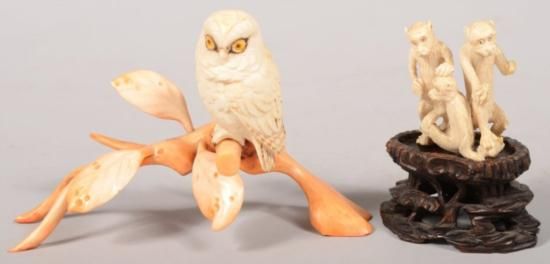 Two Carved Ivory Animals. An owl seated on an orange stained bone branch with leaves. 4inh. X 6inw. Along with three monkeys grooming each other with a carved teak base. Overall: 3 1/4inh. X 2 5/8inw. Owl has tight crack on top of head. Right end monkey missing half of left arm.