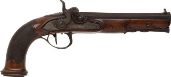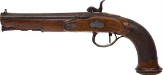 Belgian Single Shot Percussion Pistol. .64 caliber, 7-inch octagonal and grooved barrel with dovetailed blade and bead front sight. Liege proof and LC touch marks at breech. Unmarked lock. Fine checkered walnut stock with horn-tipped ramrod. Steel furniture. Condition: Very good to fine. Steel an even, smooth gray-brown patina. Patch of pitting on barrel behind nipple. Stock Very good. Numerous dents and nicks commensurate with age. Moderate flattening of checks. Crisp action.