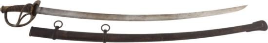 U.S. Model 1840 Cavalry Saber by Sheble & Fisher. Having a 35-inch curved blade, the ricasso marked: Sheble & Fisher/Philada. One wide fuller. Standard brass three-bar guard. Brass wire-wrapped black leather ribbed grip. Original steel scabbard with ring mounts. Nicknamed inthe Old Wristbreakerin for its reputation for breaking wrists in cavalry charges, it was the standard U.S. cavalry saber for approximately 20 years. Condition: Very good. Metal with light wear, pitting and spotting. Hilt with age wear and patina. Scabbard with age wear, patina and what appears to be a bullet impact dent under the top mount.