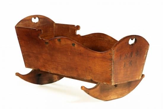ET0523120035 CRADLE. Probably Ohio or Indiana, dated 1849, walnut and poplar. Dovetailed cradle with heart cutouts. Retains its original finish and stenciling at one end inJR 1849.in 23inh. 43inl.