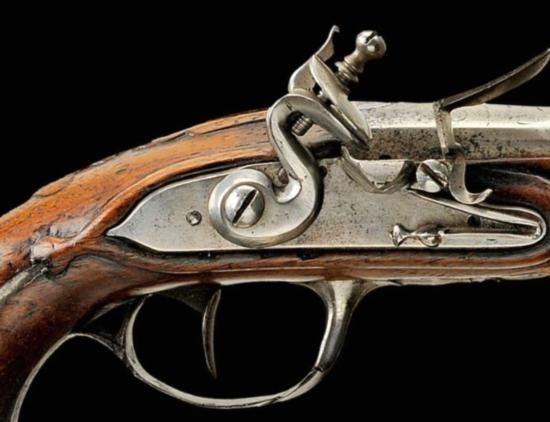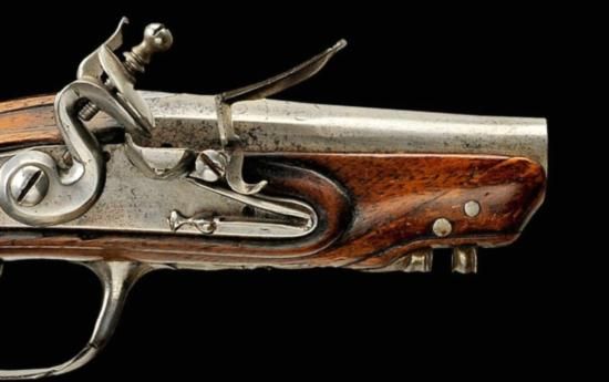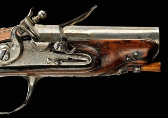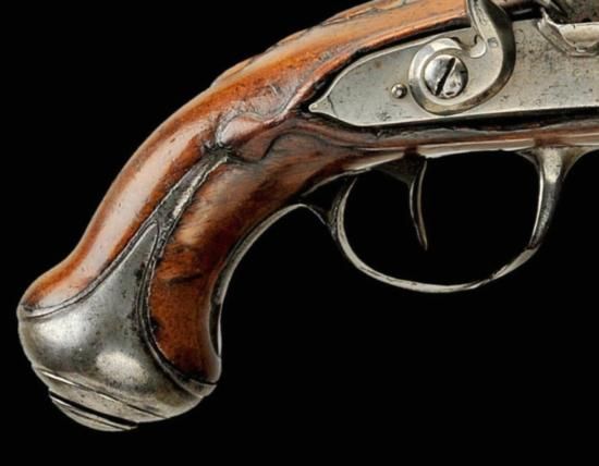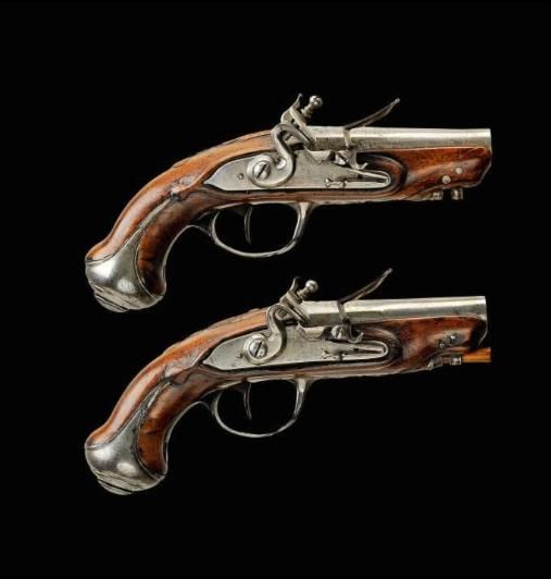 ET0606120041 A PAIR OF FLINTLOCK PISTOLS France, 18th century With round barrels decorated with arch motifs at the breech; flat locks; iron mounts; walnut stocks. In very good condition, ramrod missing. L. 16 cm.