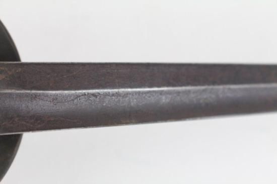 ET0617120001 AMERICAN MILITIA FIELD OFFICER'S SWORD Circa 1830s American Field Officer's Sword. 32in single edged straight blade with faded yet still visible intricate blue-gold etching from hilt to tip. Folding clamshell counterguard covers an etched ricasso, and is decorated with a brass eagle and an accompanying female freedom figure. The guard has more floral designs with another figurine. A wire bound mother of pearl grip is topped off with a knights-bust pommel. Overall good condition, tarnish and rust towards the tip of blade.