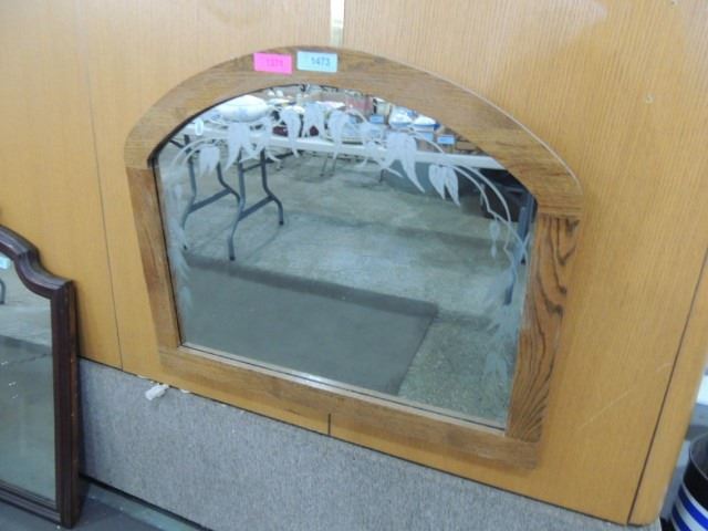 OAK FRAMED DECORATIVE ETCHED GLASS WALL MIRROR, HANGING MIRROR, DETAILS LEAVE ETCH, FRAMED ROUNDED TOP, AS SHOWN SEE PHOTO FOR MORE DETAILS