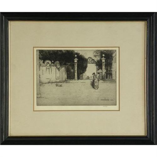 ETCHING, Edward Millington Synge (1860-19130, English. Dog and Figures before a Gateway. Signed lower right. Plate signed and dated ''1905'' lower right. Matted and placed in a simple black frame with gold trim. 7'' x 10''/ 16.25'' x 19'' framed.