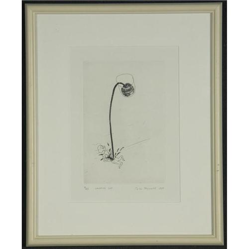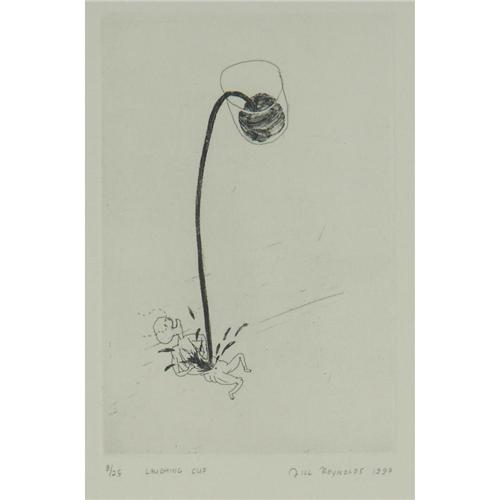 ETCHING, Jill Reynolds (1956-), WA/NY., Glass artist. ''Laughing Cup''. Signed and dated ''1990'' lower right. Numbered 8/25 lower left. Titled lower center. Matted and placed in a white wood frame, frame as seen. More info. at the front desk. 8.75'' x 5.75''(plate size)/ 17.25'' x 14'' framed.