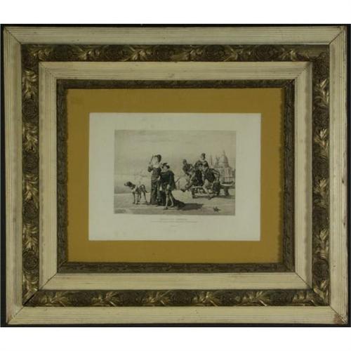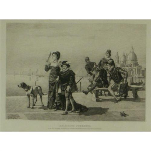 ETCHING ON PAPER 11 1/2'' x 15 1/2'', Original painting by Lorenzo Delleani (1840-1908), Italy., Etched by P. Teyssonnieres (19th century), France. ''Malicious Comments''. Plate signed by Teyssonnieres lower left. Title and copyright info. lower center. Note condition. Matted and placed in a vintage frame with cream reeded exterior and center piece and gilt trim, as seen. Note chipped glass upper left.
