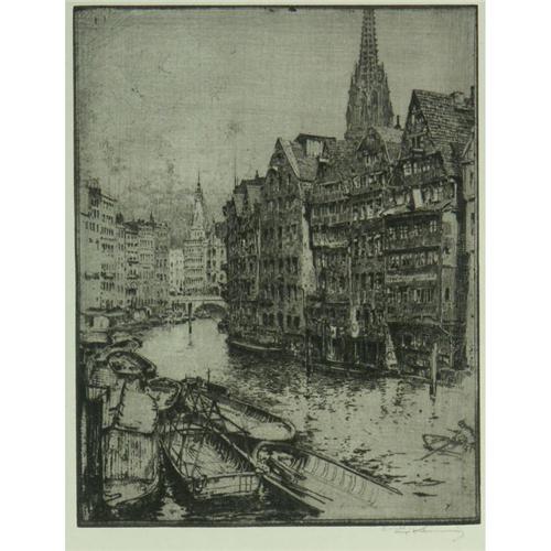 ETCHING 12.5'' x 9.75'' (image area), Likely Luigi Kasimir (1881-1962), CA. A European Canal Scene. Signed lower right. Placed in a thin carved wood frame.