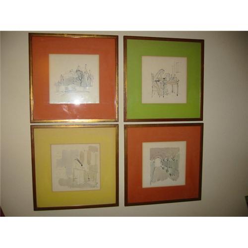 SET OF 4 ETCHING DRAWING NUNS (1) PRAYING IN THE, (2), SEWING, (3) CHURCH AND 4 OUTSIDE OF A CHURCH OR A MISSION. VERY DECORATIVE, AND VERY COLLECTIBLES. THEY ARE APPROX. 12X12 INCHES INCLUDING THE FRAMES. THEY ARE RED WOOD FRAMED WITH TOUCH OF GOLD, IN LOS ANGELES, CALIFORNIA ACCENTED WITH GREEN, ORANGE OR PEACH, AND YELLOW COLOURED MATTS. THEY ARE DELIGHTFUL, LIGHT WEIGHT AND IF PLACED TOGETHER, WILL BE VERY GOOD LOOKING AND BRIGHTENS ANY ROOMS IN THE HOUSE OR OFFICES. THEY ARE NOT NEW BUT VERY DECORATIVE AND SMOOTH.