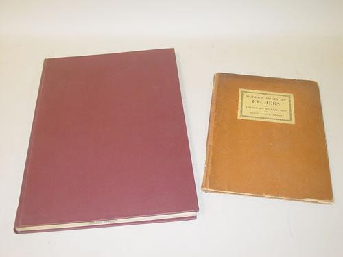 ETCHINGS. A Group of 2 Volumes as Listed. Hard Cover. Ex-Library. ***Twenty American Etchings - Original and Reproductive - After Paintings by Gilbert Stuart, Washington Allston, George Inness - With Descriptive Text by S.R. Koehler (1887) Troy, NY: Nims and Knight. Elephant Folio, in a library binding, with 12 (of 20) mounted engravings, with descriptive text. Binding & hinges tight. ***Modern American Etchers - Arthur William Heintzelman with Notes by John Taylor Arms (1927) NY: Minton, Balch & Company. Folio in paper over boards with paper label on front cover. Unpaginated, 12 plates with descriptive text. Covers show edge/corner wear, hinges taped, binding tight.