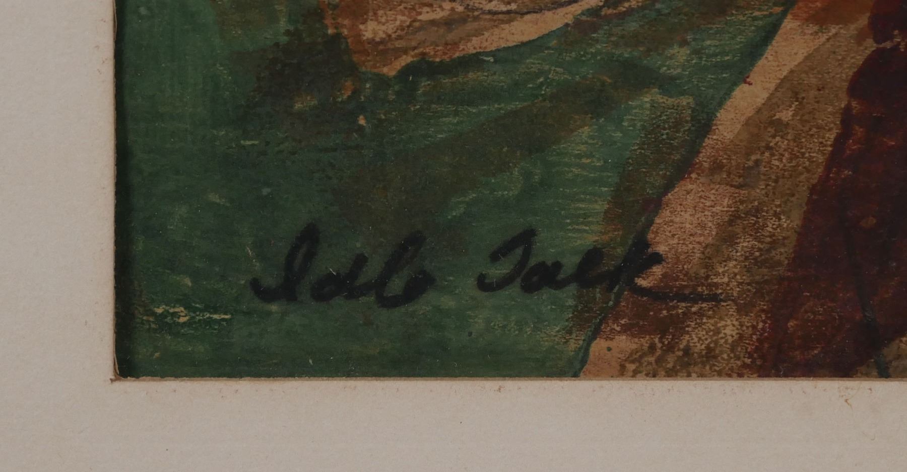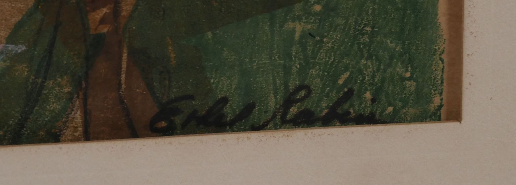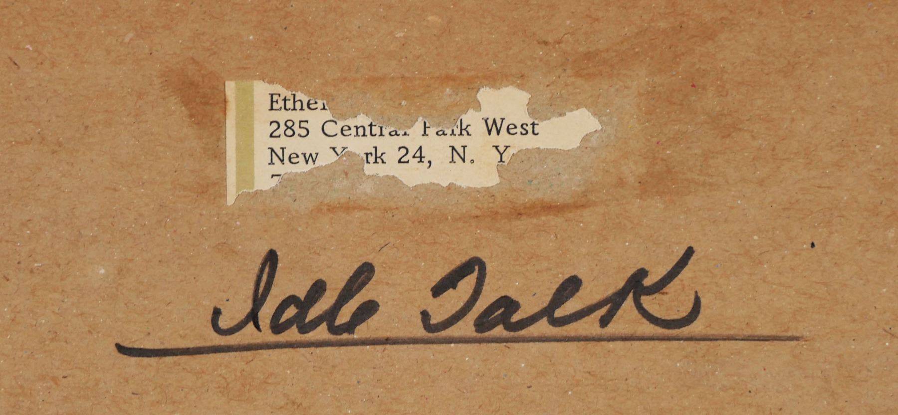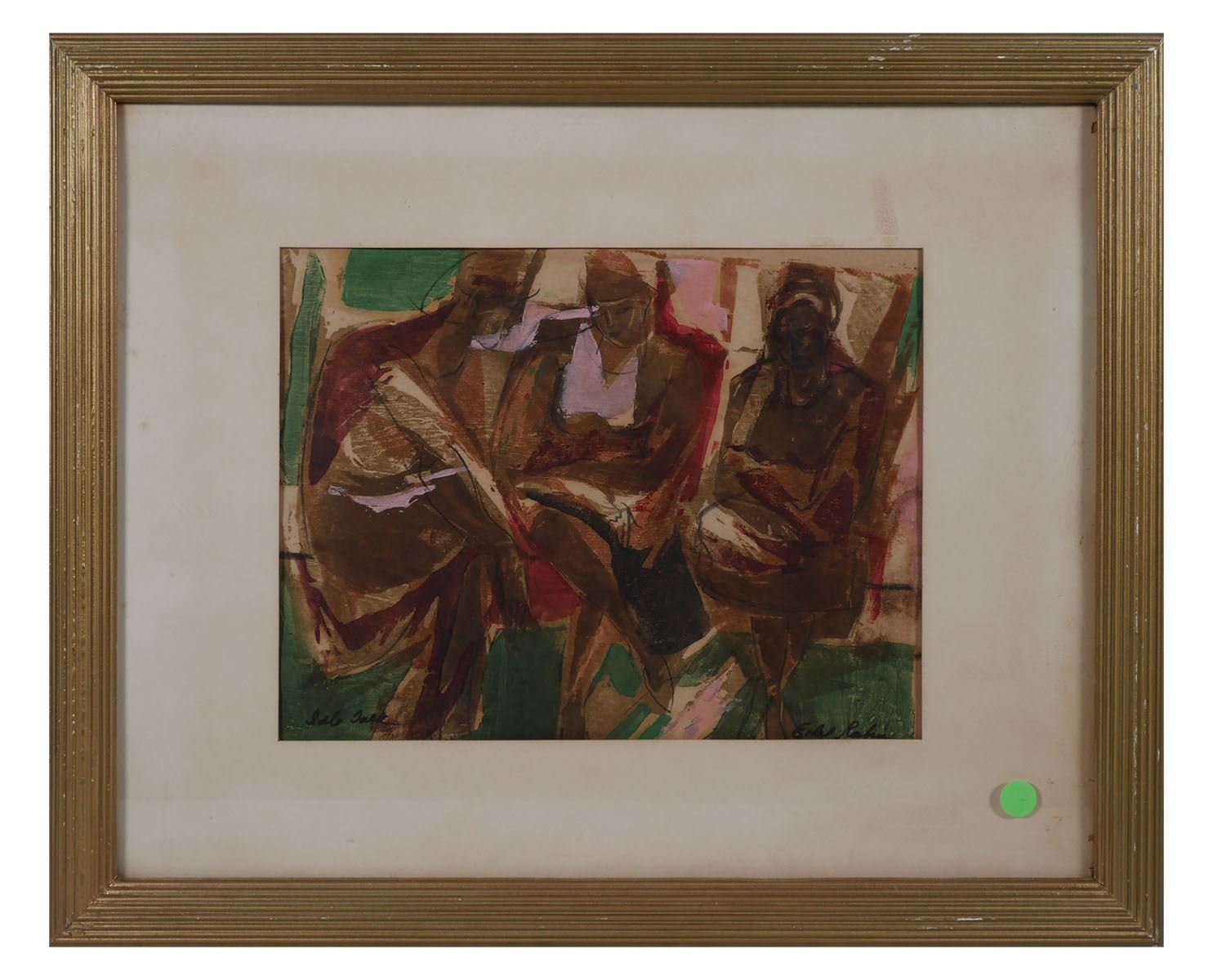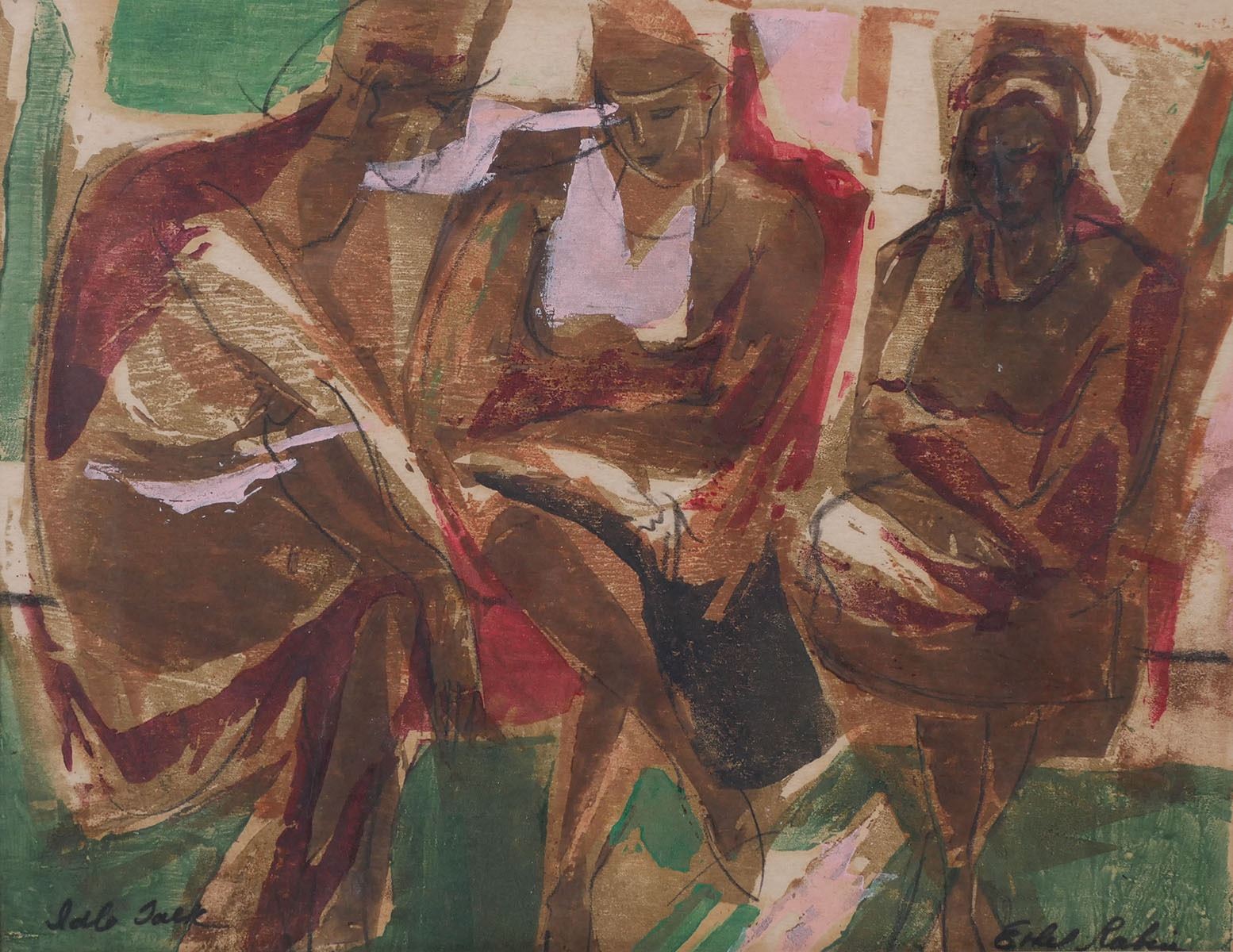 Expressionist figural woodblock print in colors by Ethel Rabin (American, 20th). Circa 1940s. Signed in crayon at lower right and titled "Idle Talk". Excellent condition. Overall framed size is 19 1/2" x 23 1/2".