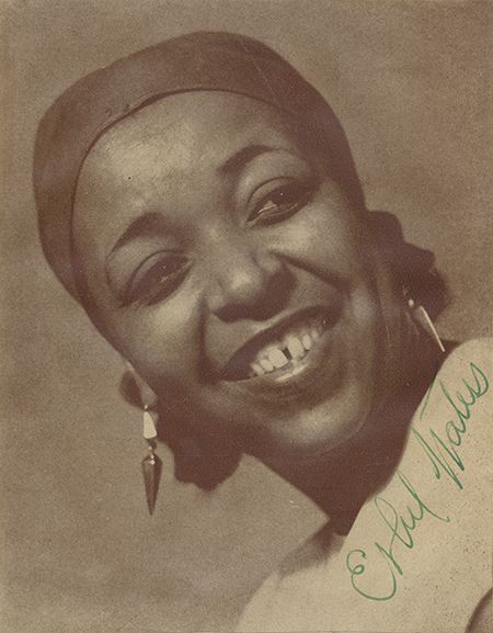 (1897-1977) African-American singer and actress who brought black urban blues into the mainstream. She began her career after moving to New York City in 1919, at the start of the Harlem Renaissance. Printed newspaper image 4 1/2" x 5 1/2" sepia, signed in green ink. Mounted, good.