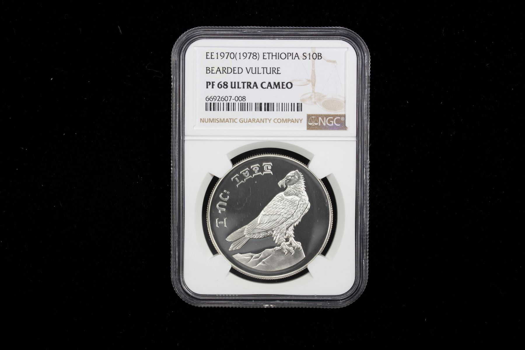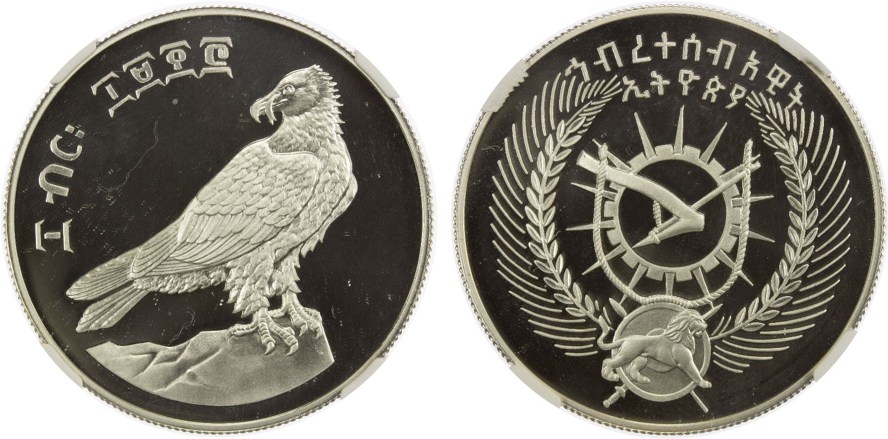 ETHIOPIA: People's Democratic Republic, AR 10 birr, EE1970 (1978), KM-61a, 15th anniversary of the WWF- Bearded Vulture, struck at the British Royal Mint, NGC graded Proof 68 ULTRA CAMEO.