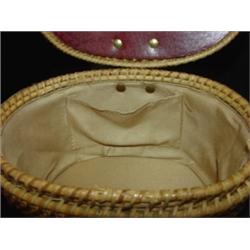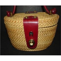 ETIENNE AIGNER LADIES' PURSE. Marked on underside of lid. Wicker exterior. 12" H to top of handle, 8.75" W, 6.25" D
