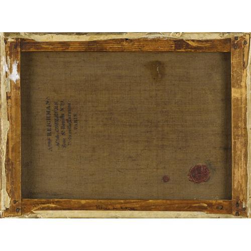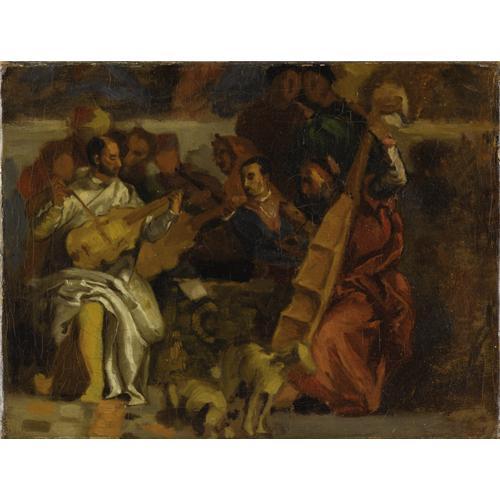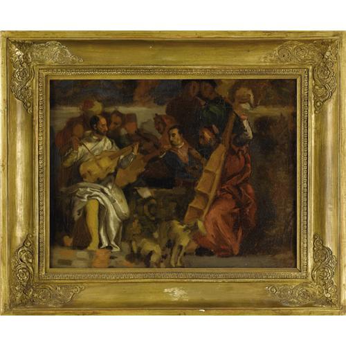 <B>EUGÈNE DELACROIX</B></I> (French 1798-1863)<BR><I>Musicians</B></I> (after a detail from Veronese's The Marriage at Cana), circa 1820<BR>Oil on canvas<BR>9 x 12 inches (23.5 x 31 cm)<BR>Initialed to stretcher in graphite: <I>E.D.</B></I><BR><BR>Provenance:<BR>Delacroix's posthumous sale, February 1864, probably part of lot 176 (<I>“Six toiles contenant des fragments d'études d'après Rubens, Véronèse, Murillo, etc.”</B></I> without dimensions), to Gaultron, 18 francs;<BR>Purchased (?) by Bernheim-Jeune from Cher fils, 10 June 1924;<BR>Sold by Bernheim-Jeune to Dru, 25 May 1925 (Archives Bernheim-Jeune: <I>“Copie des musiciens d'après le Tintoret,”</B></I> 26 x 27 cm.);<BR>Private collection, circa 1946-86 (Geneva, Switzerland);<BR>Acquired by the present owners in 1987<BR><BR>Literature:<BR>Inv. Delacroix, no. 78 (<I>“1 tableau représentant un fragment des 'Noces de Cana,' d'après Véronèse, par M. Delacroix , 15F.”)</B></I> or no. 198 (same description and valuation);<BR>Lee Johnson, <I>The paintings of Eugène Delacroix. A Critical Catalogue,</B></I> vol. VI (The Public Decorations and their Sketches, supplement and plates), Clarendon Press, Oxford, 1989, ill. plate 70; cat. no. 13a, p. 199.<BR><BR>An important facet of Delacroix's personal artistic education and inspiration involved making oil sketches after the Old Masters. The artist whose works he studied and emulated most passionately through this process of copying was Rubens. After Rubens, Delacroix was particularly drawn to the work of the Venetians: Titian, Veronese, and Cariani (whose work was given to Bellini at the time). As this sketch after Veronese's sumptuous <I>Marriage At Cana</B></I> in the Louvre inv. no. RF119 demonstrates, Delacroix frequently studied fragments of large, ambitious multi-figural compositions in relatively small formats. In this intimate canvas Delacroix devoted his attention to a dense group of seated figures, a variety of musical instruments displayed at a range of jaunty angles, and even a pair of dogs-all of which the great Venetian painter had managed to compress convincingly into a very shallow space. Delacroix seems to have been particularly fascinated with the Veronese's magical handling of the play of light on form. This is especially apparent in his attention to the marvelous curves of the bass displayed so that it is perpendicular to the picture plane. Working rapidly but with keen concentration to tonal shifts and slight differences in hue, Delacroix masterfully conveyed the essence of Veronese's painterly manner.<BR><BR>Although the catalogue of Delacroix's posthumous sale of February 1864 lists only two paintings after Veronese's <I>The Marriage at Cana</B></I> the present work and one other , there were three, all attributed to Delacroix, listed in Delacroix's inventory. Another of his artist's oil studies after Veronese's painting records <I>Two Bearded Heads</B></I> (private collection, Paris; see Lee Johnson, vol. I, 1981, cat. no, 14, p. 12; ill. vol. II, plate 11), at the same scale as the original. According to a firsthand account of Delacroix's artist friend, Charles Soulier, the former copied the motif of the bearded men by standing on the top of a tall ladder in the Grand Salon of the Louvre on June 10, 1820. The heads of the two men which captured Delacroix's interest derive from the foreground of <I>The Marriage at Cana,</B></I> just left of the instrumentalists depicted in the present study. Soulier's account is useful is providing an approximate date for this sketch as well.<BR><BR> <B>Condition Report:</B> relined, reinforcing significant craquelure, one minor restoration to canvas, one inch vertical repair off center top left between clusters of figures, strong colors<BR><BR><b>Shipping:</b> Requires 3rd Party Shipping (<a target="_blank" href="http://www.heritageauctions.com/common/shipping.php">view shipping information</a>)