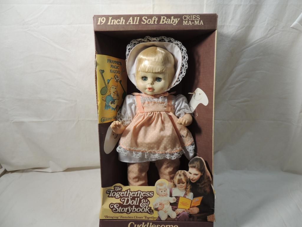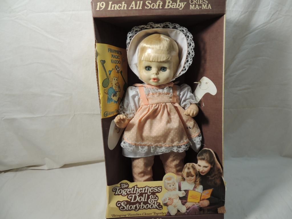THE TOGETHERNESS DOLL & STORY BOOK. FRANNIES MAGIC KAZOO. 19" ALL SOFT BABY CRIES. MA-MA. CHILDRENS HOUR DOLLS. IN ORIGINAL BOX. VINTAGE. DOLL. AS SHOWN SEE PHOTO FOR MORE DETAILS