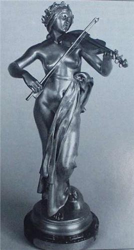 EUGENE DELAPLANCHE (1836-1891) French school. A finely cast brown patinated symbolist bronze figure of a young semi-nude lady playing a violin. Signed. With Barbedienne Foundry mark. Excellent patina. Approx. 24" high. Ref. Benezit, vol. 3, page 141. 7000-8000