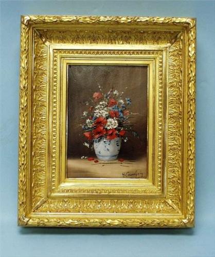 EUGENE-HENRI CAUCHOIS (1850-1911) French School. "Fleurs dans un Vase". Oil on wood panel. Signed lower right. Titled in reverse. 8 1/2" x 6". In gilt frame. Ref. Benezit, vol. 2, page 379. 3000-3500