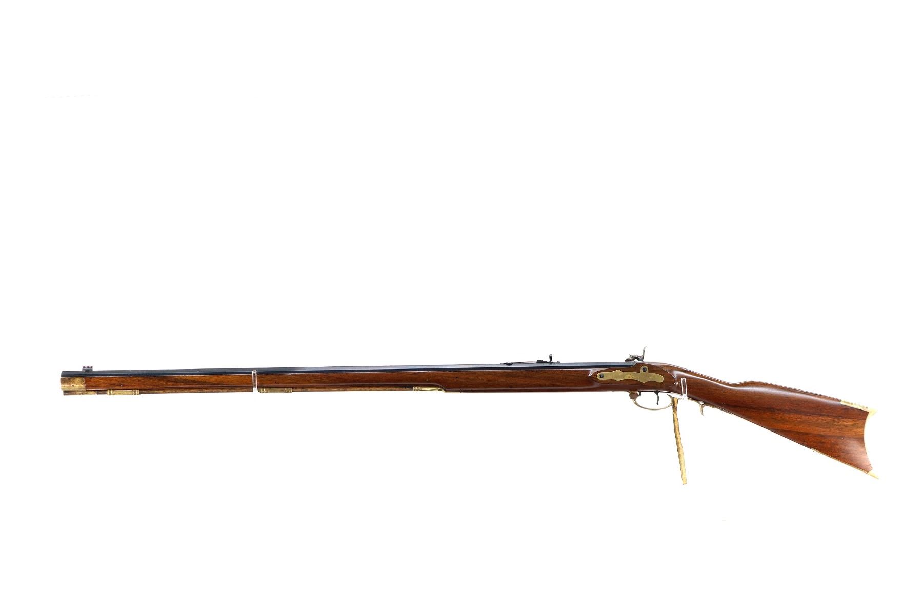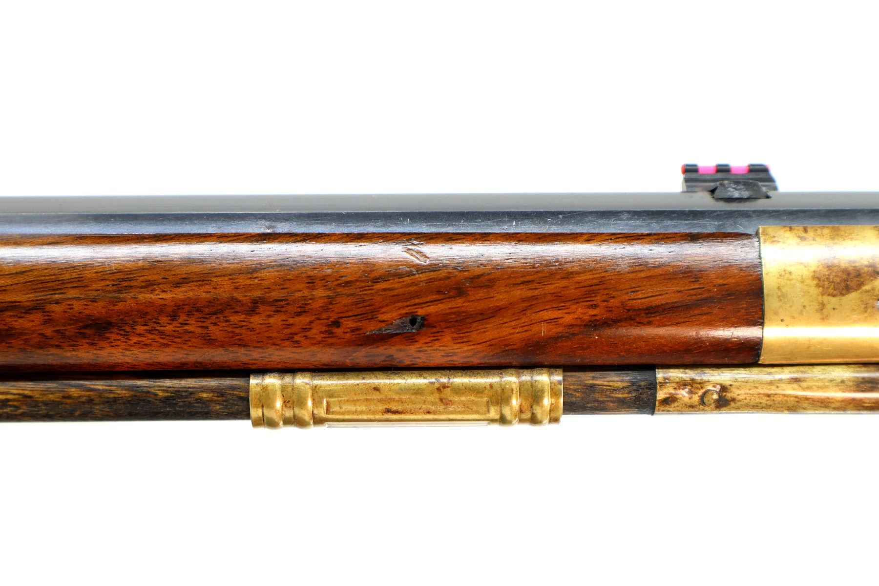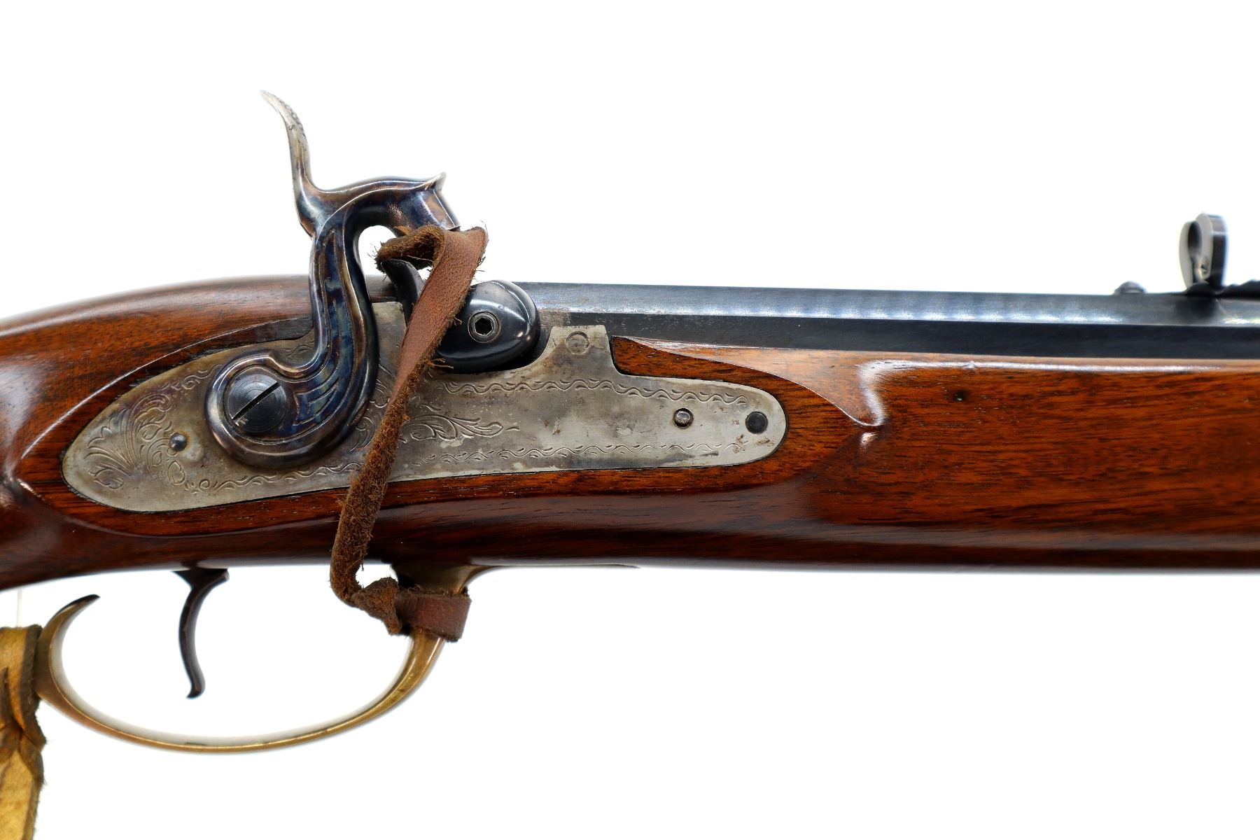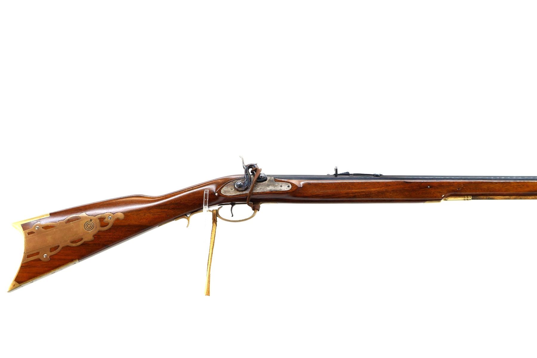 Main Description: Red fiber optic blade front sight, adjustable u notched full buckhorn rear sight, blued octagon barrel, engraved lock with checkered spur hammer that functions, nipple is intact. One piece full length wood stock, straight grip, smooth curved brass butt plate, patch box, finger rest trigger guard and nose cap, wood ramrod with brass tip.