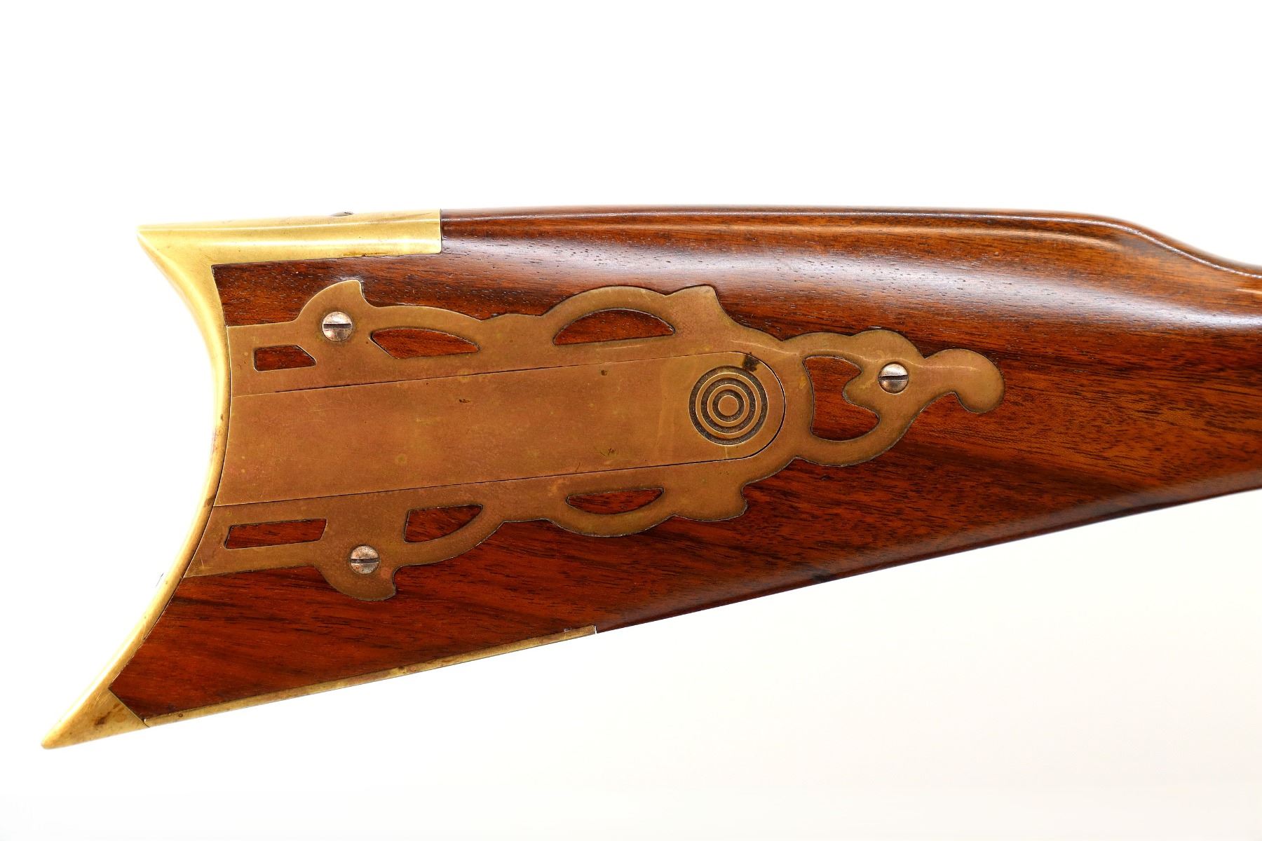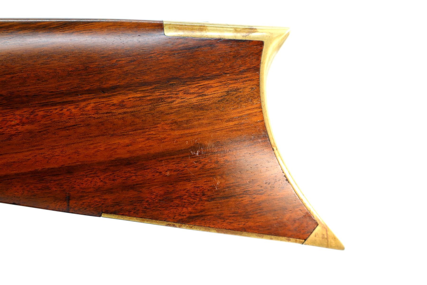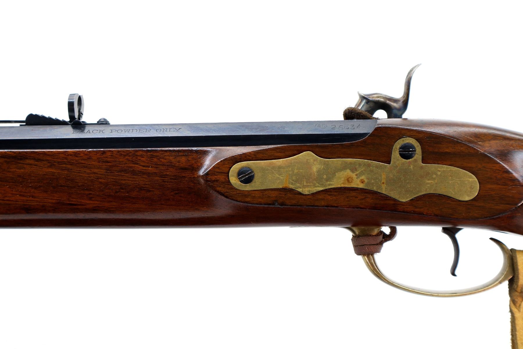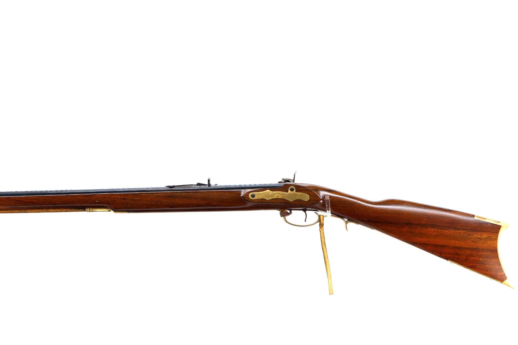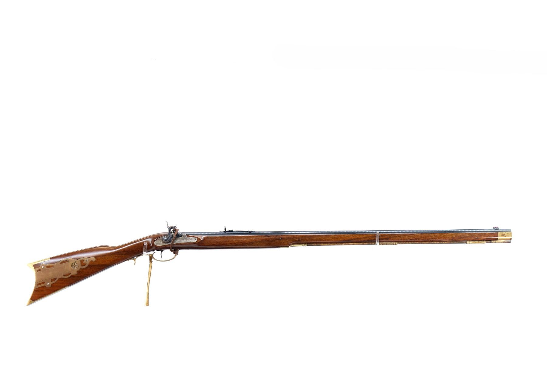 Main Description: Red fiber optic blade front sight, adjustable u notched full buckhorn rear sight, blued octagon barrel, engraved lock with checkered spur hammer that functions, nipple is intact. One piece full length wood stock, straight grip, smooth curved brass butt plate, patch box, finger rest trigger guard and nose cap, wood ramrod with brass tip.